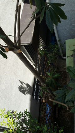 1階から2階から、ビワの木の枝をバサバサと、のこ切る、、枝を切り落とす、、