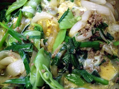 家にあったニラと茹でたオランダ豆を加えて味付けをして卵でとじて…